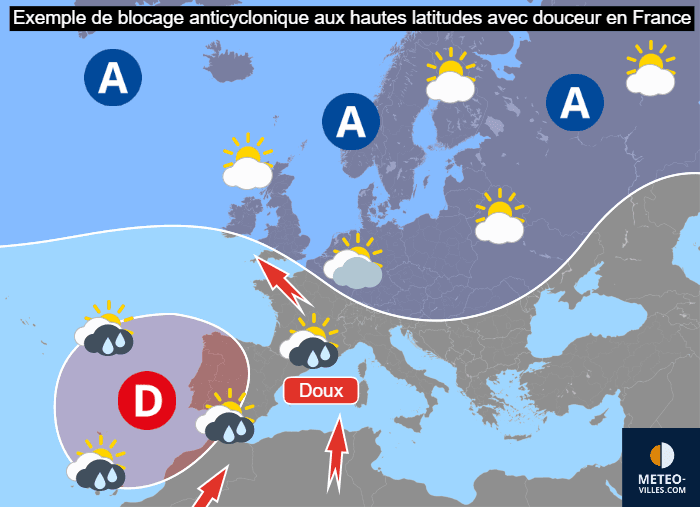 Exemple de situation anticyclonique aux hautes latitudes avec air doux sur la France - Météo Villes