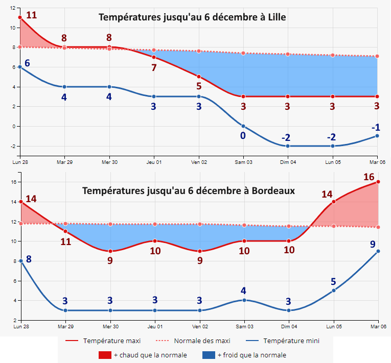 Températures prévues à Lille et Bordeaux du 28 novembre au 6 décembre 2022 - Météo Villes