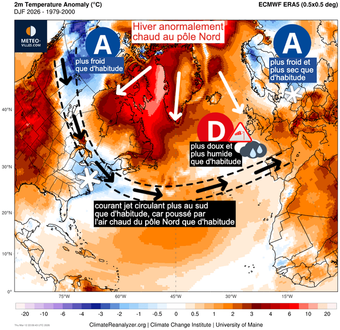 En fait, toutes ses anomalies sont liées entre elles. En effet, les températures exceptionnellement élevées au pôle Nord ces derniers mois ont engendré un vortex polaire très perturbé ainsi qu'une circulation très méridionale du courant jet.