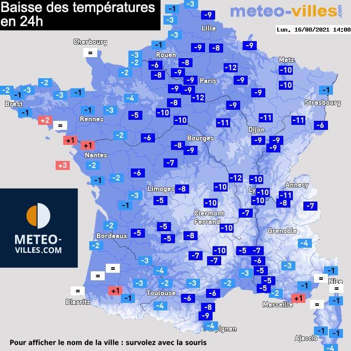 Ce 16 août, l'air océanique a de nouveau envahi le pays et les températures ont accusé une chute vertigineuse, perdant souvent 8 à 10°C par rapport à la veille, parfois 12 ou 13°C sur le Centre-Est et le Nord-Est !