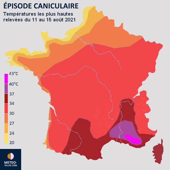 Températures maximales atteintes pendant la période caniculaire du 11 au 15 août 2021 en France – Météo-Villes