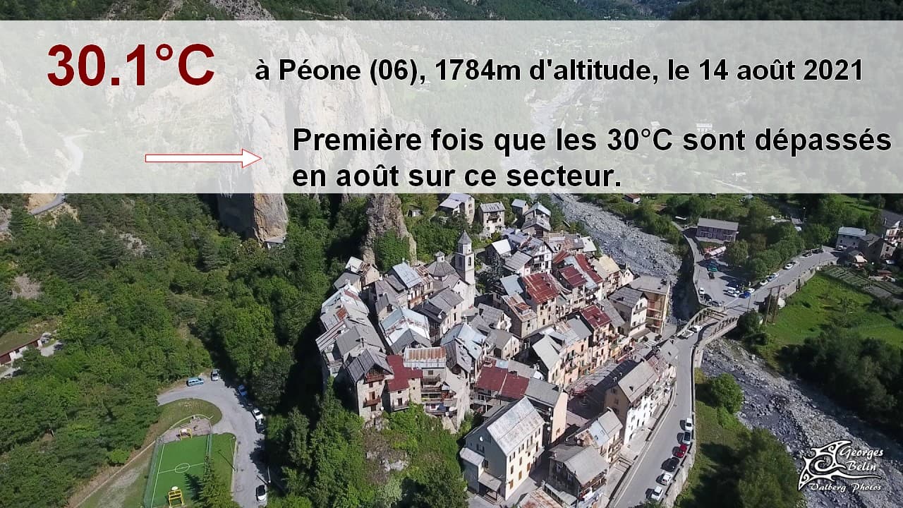 Un record mensuel de chaleur a d'ailleurs été battu à Péone (06), 1784m d'altitude avec une maximale de 30,1°C, battant les 29,3°C du 04/08/2017, c'est la première fois que les 30°C sont dépassés en août sur ce secteur et la 3ème valeur la plus élevée tous mois confondus.