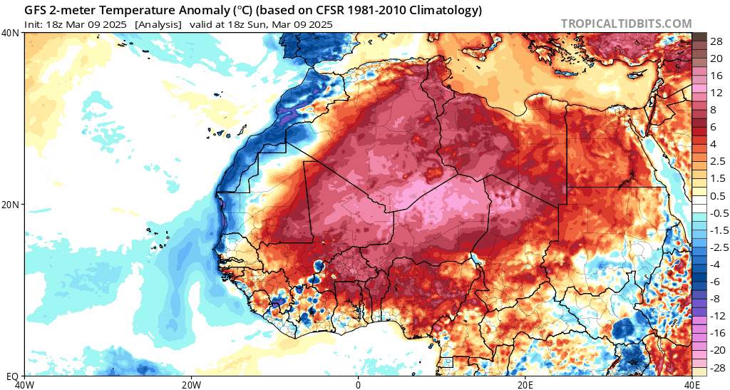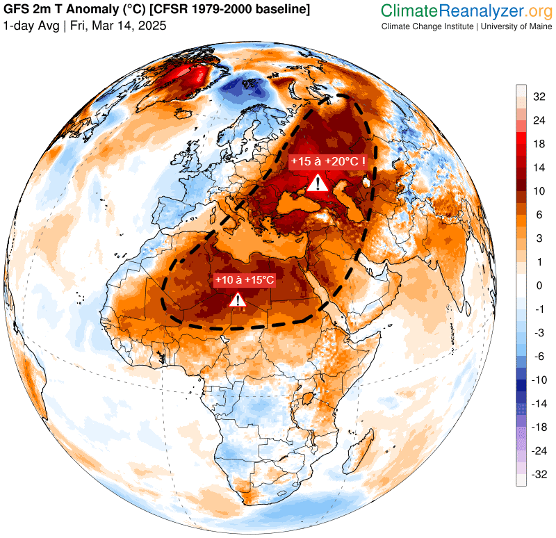 Anomalies de températures ce 14 mars 2025 entre l'Afrique et l'Europe – via ClimateReanalyzer