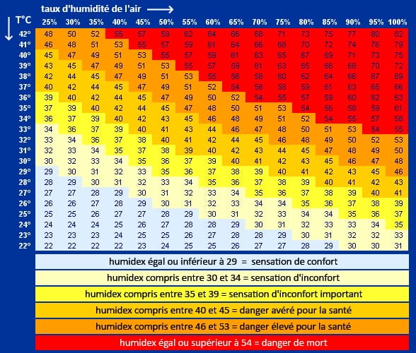 Le tableau ci-dessus montre l'indice humidex en fonction de la températures relevée sous abri et du taux d'humidité de l'air. Ainsi, on constate qu'une température de 22°C sous abri associée à un taux d'humidité de 90% donne un humidex de 30, suffisant à créer un sentiment d'inconfort. À l'inverse, une température de 28°C sous abri sous un air sec ne contenant que 25% d'humidité donnera un humidex de 28, soit un ressenti plus agréable que dans le cas précédent !