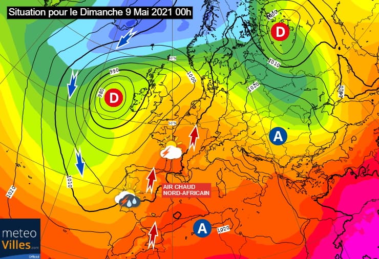 Alors que nous sommes jusqu'à présent sous l'influence d'un courant océanique instable et frais, l'anticyclone va s'étendre vers la France puis l'Europe Centrale au cours du week-end des 8 et 9 mai 2021. Pendant ce temps, les dépressions resteront positionnées au large sur l'Atlantique et les Îles Britanniques avec un talweg plongeant jusqu'au large du Portugal. Cette configuration va favoriser la mise en place d'un flux de sud dynamique dès samedi.