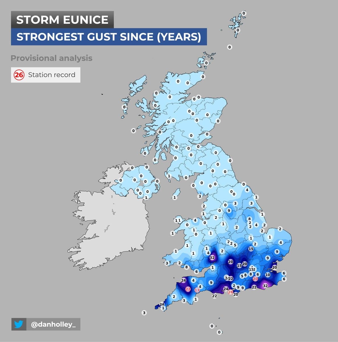 Nombre d'années depuis la plus forte rafale enregistrée lors de la tempête Eunice sur l'Angleterre – via Twitter @danholley_