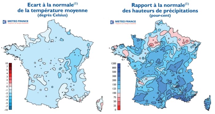Anomalies thermiques et quantités de pluie en France en juillet 2000 - via Météo France