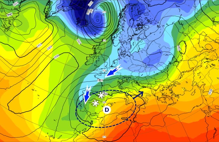 En glissant de la péninsule ibérique vers l'Italie, une dépression va générer un épisode neigeux exceptionnel chez nos voisins espagnols, débordant vers les Pyrénées.