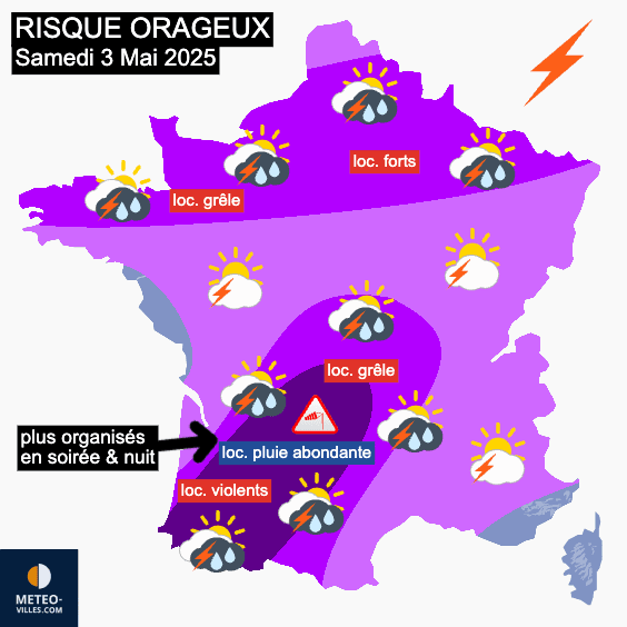 Dans ce contexte fortement instable, la journée du samedi 3 mai 2025 promet d'être lourde. Le risque orageux apparaîtra sur de nombreuses régions en journée, se renforçant de la Bretagne aux Ardennes où des orages localement forts (grêle possible) pourront être observés en après-midi et soirée. D'autres éclateront dans le quart sud-ouest avec une vague orageuse sans doute plus organisée et virulente en soirée et nuit de l'Aquitaine au Massif Central, faisant craindre grêle, rafales de vent et pluies abondantes.