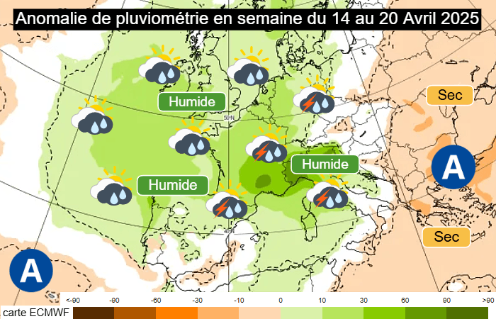 Les modélisations pour la semaine du lundi 14 au dimanche 20 avril 2025 réagissent fortement. Comme le montre la carte ci-dessous, une forte anomalie humide est attendue sur l'ouest du continent européen. Celle-ci englobe l'ensemble de la France, où les précipitations seraient parfois copieuses. Les signaux humides les plus forts concernent le sud-est de la France et le nord de l'Italie.