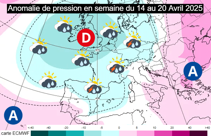 Anomalie de pression modélisée en semaine du lundi 14 au dimanche 20 avril 2025 - ECMWF