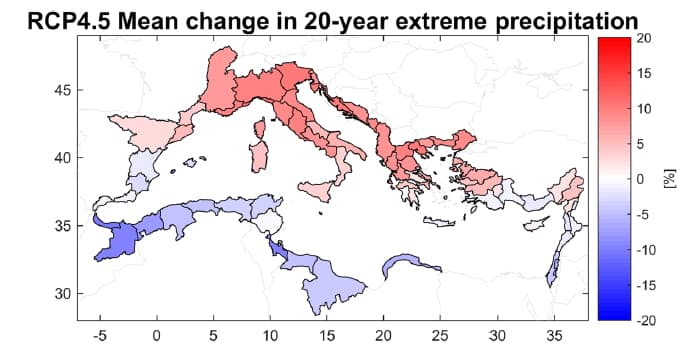 Les différents scénarios s'accordent sur une tendance à la hausse de 5 à 15% des cumuls lors des épisodes les plus intenses sur nos régions méditerranéennes avec l'augmentation la plus forte entre les Cévennes et la côte d'Azur, moins prononcée vers le Roussillon. D'une manière générale, cette intensification des épisodes méditerranéen se ferait particulièrement sentir de l'Italie jusqu'à la Grèce.