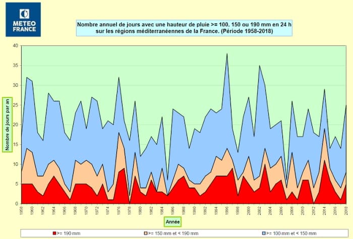 En observant les courbes, on constate qu'aucune tendance évolutive ne s'observe véritablement entre 1958 et 2018. Une forte variabilité d'une année sur l'autre est observée depuis des décennies mais il n'y a pas de tendance générale à l'augmentation des épisodes méditerranéens, dont la fréquence semble rester plus ou moins stable malgré le réchauffement.
