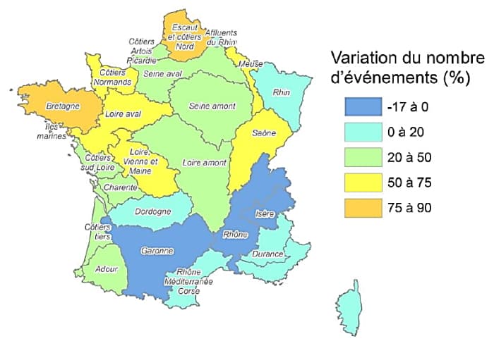 Variation du nombre d'événements (en %) pouvant causer des inondations entre 2000 et 2050 - via senat.fr