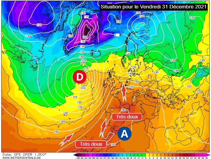Masses d'air prévues pour le vendredi 31 décembre 2021 - via wetterzentrale.de