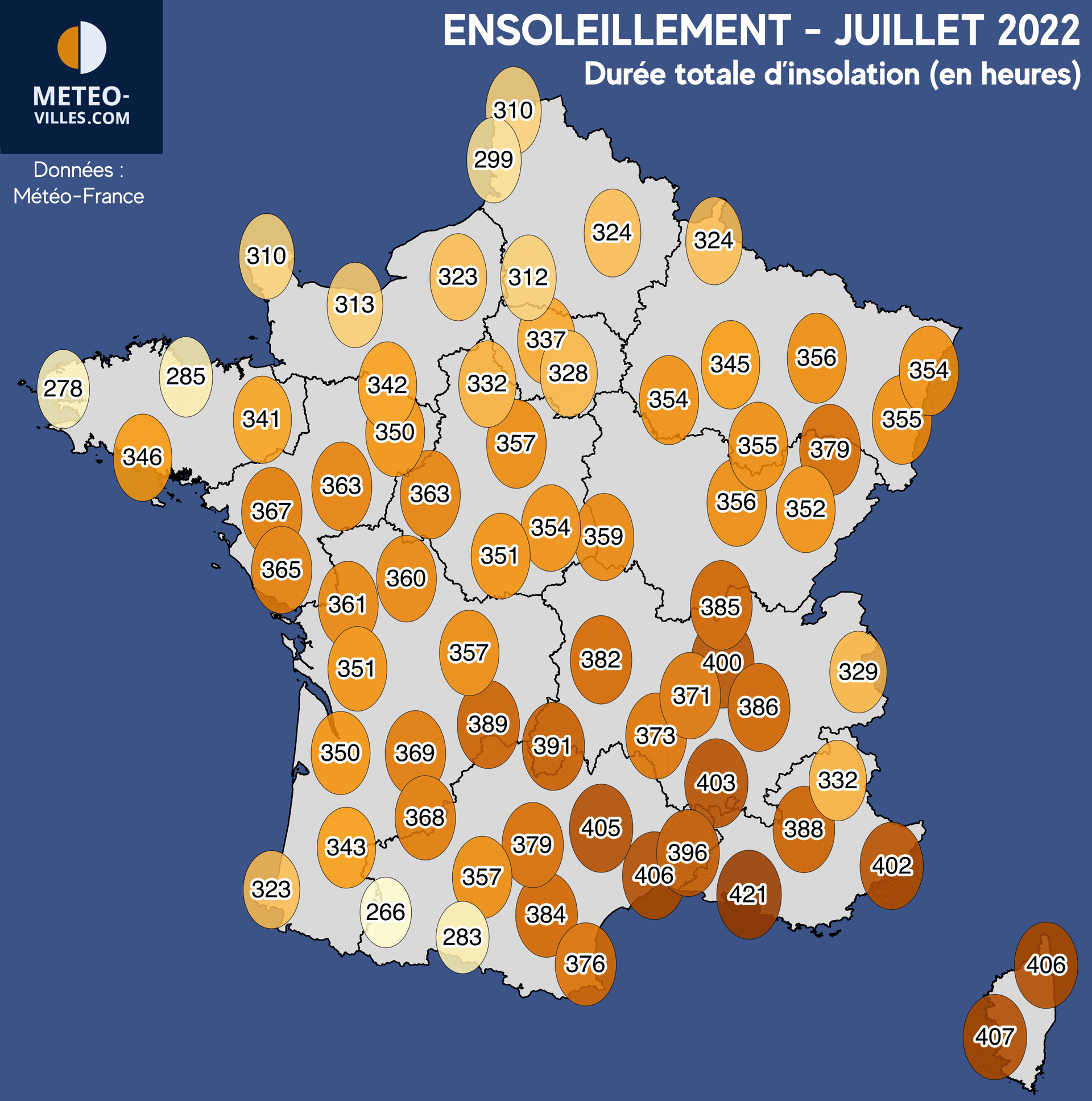 Taux d'ensoleillement en France durant le mois de juillet 2022 - Météo Villes