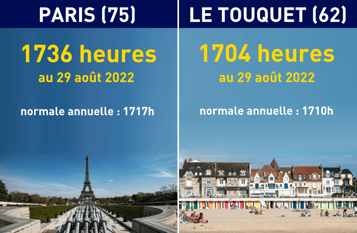 Au 29 août 2022, Paris avait déjà dépassé sa normale annuelle d'ensoleillement avec 1736 heures (contre 1717h) ! Dans le Pas-de-Calais, Touquet s'apprêtait à la dépasser avec déjà 1704 heures (normale annuelle de 1710h). Il reste pourtant encore plus de quatre mois avant la fin de l'année ! Paris comme Le Touquet peuvent espérer dépasser les 2000 heures d'ensoleillement en 2022, seuil qui n'a été atteint que 3 fois au XXIème siècle à Paris (en 2003, 2019 et 2020) et deux fois au Touquet (en 2003 et 2018).