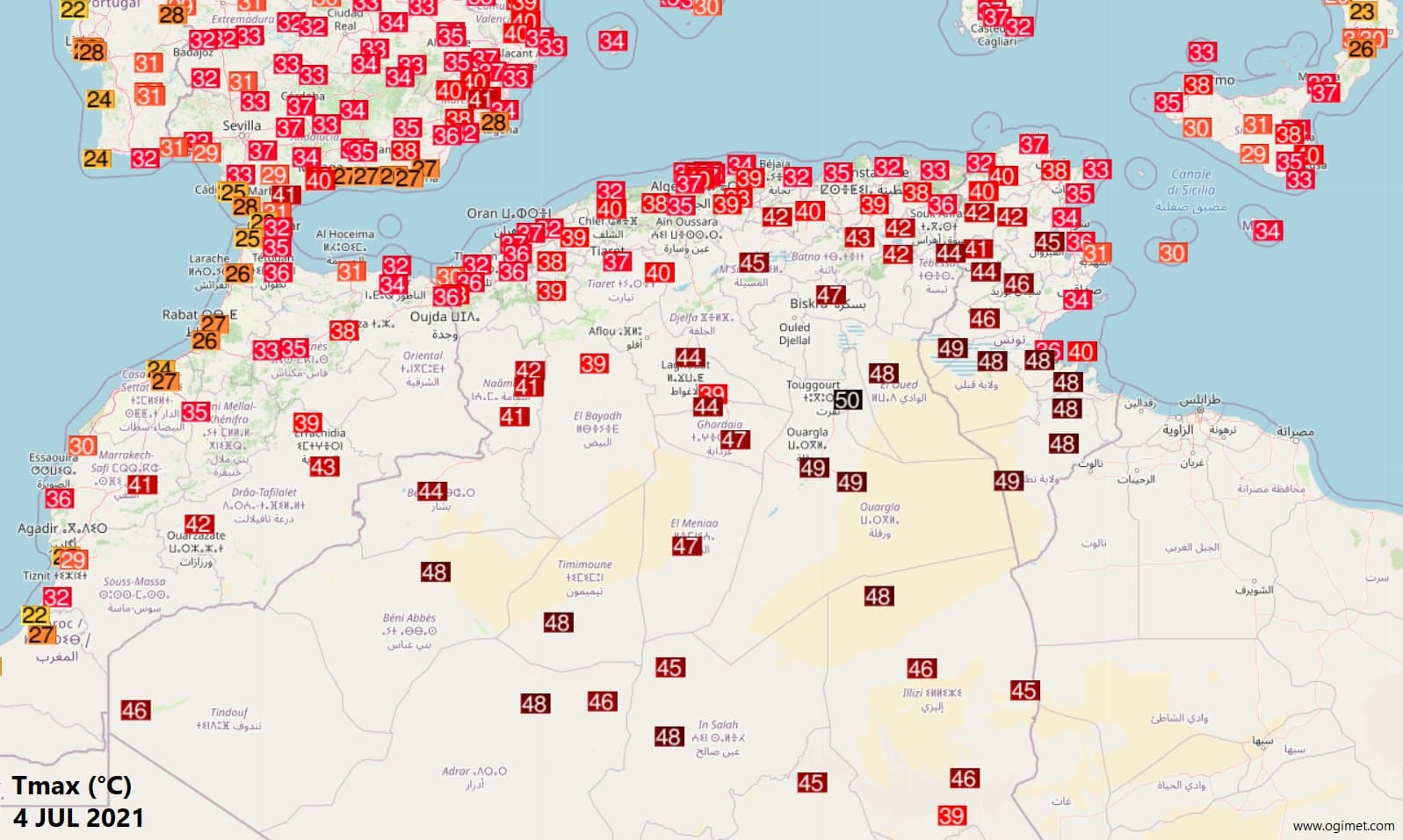 Températures maximales relevées sur le Nord de l’Afrique le 4 juillet 2021 – Via Twitter @EKmeteo