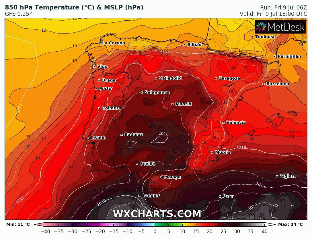 Animation des températures à 850 hPa sur l’Espagne entre le vendredi 9 et le mardi 13 juillet 2021 – Modèle GFS via WX CHARTS