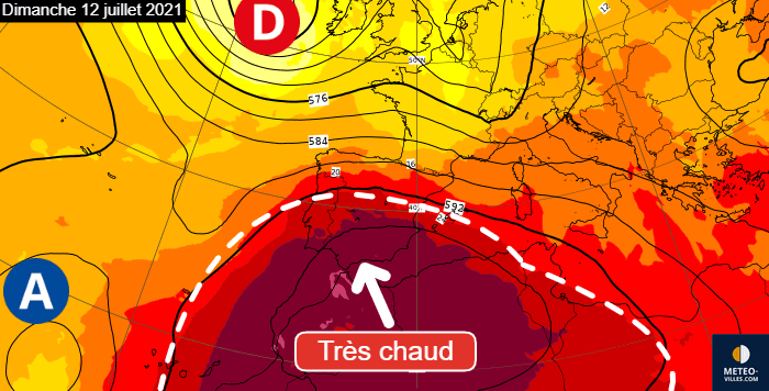 Sur l’Espagne, c’est également une situation de blocage qui se met en place ce week-end des 10 et 11 juillet 2021 avec une stabilisation de la masse d’air en marge d'un vaste anticyclone sur l'Atlantique, un ensoleillement très important mais surtout l’advection d’air particulièrement chaud venu du Sahara.