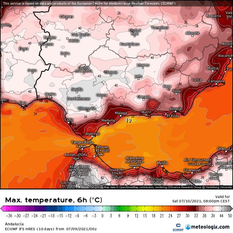 Températures maximales prévues le Sud de l’Espagne ce samedi 10 juillet 2021 – Modèle ECMWF HIRES via meteologix