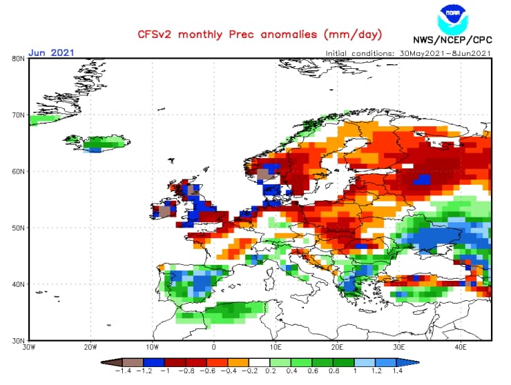 Anomalies pluviométriques pour le mois de juin 2021 - modèle américain via NOAA