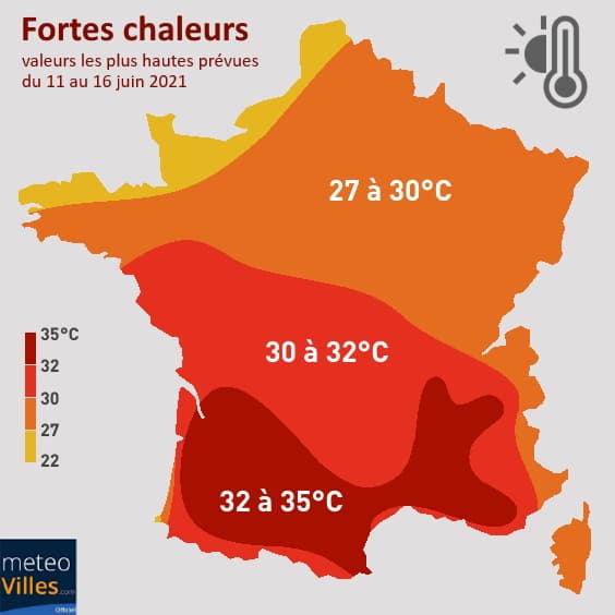 L'épisode de fortes chaleurs continuera de s'affirmer durant les après-midi du dimanche 13 et du lundi 14 juin 2021. Il fera alors 27 à 30°C sur le quart nord-est de la France et souvent 30 à 32°C au sud de la Loire. Toutefois, des valeurs de 33 à 35°C sont attendues des plaines du sud-ouest vers le Languedoc. Les valeurs les plus hautes sont modélisées sur l'arrière-pays méditerranéen et notamment vers le Roussillon.