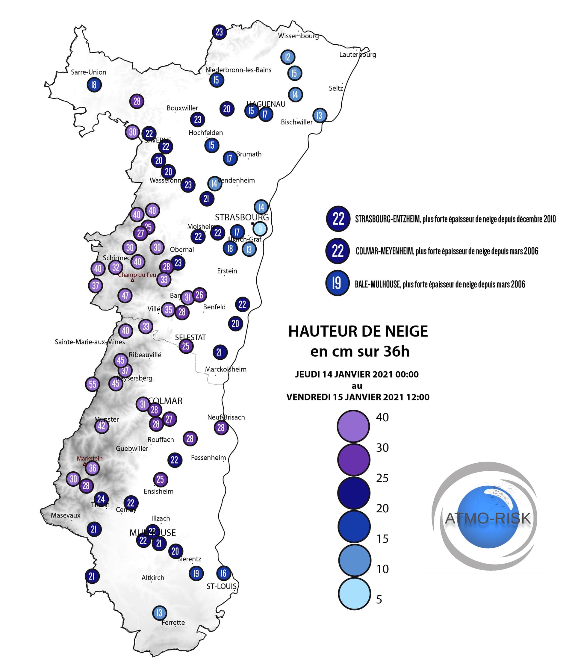 Hauteur de neige relevée sur l'épisode du 14 au 15 janvier 2021 en Alsace - Via Atmo-Risk