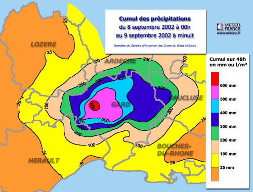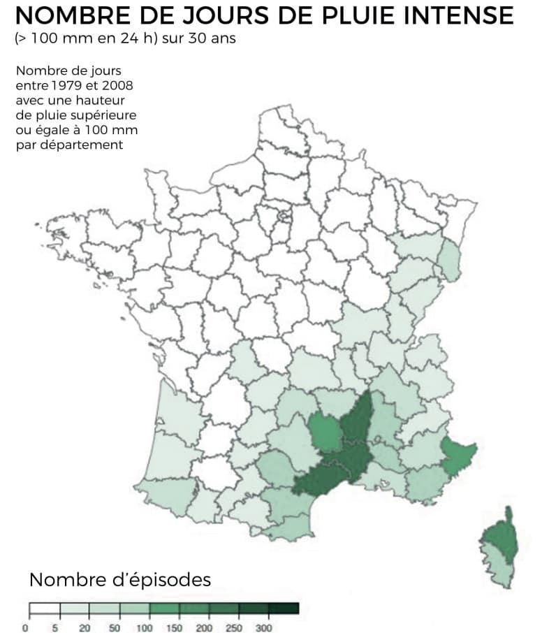 Ainsi, les régions méditerranéennes sont, plusieurs fois dans l'année et plus souvent en automne, soumises à des dégradations pouvant déverses plusieurs centaines de millimètres en une seule journée. Récemment, 500.2mm avaient pu être relevé à Saint-Martin-Vésubie (06) en 24h le 3 octobre 2020 avec des inondations exceptionnelles à la clef. Le 14 octobre 2018, 244 mm avaient pu être relevés en 6 heures à Trèbes (11), en 1988, 420mm était tombés à Nîmes en environ 12h.