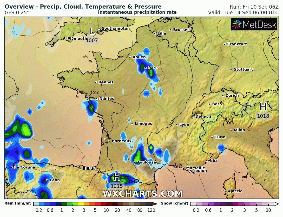 Animation des précipitations du mardi 14 au samedi 18 septembre 2021- Modèle GFS via WX CHARTS