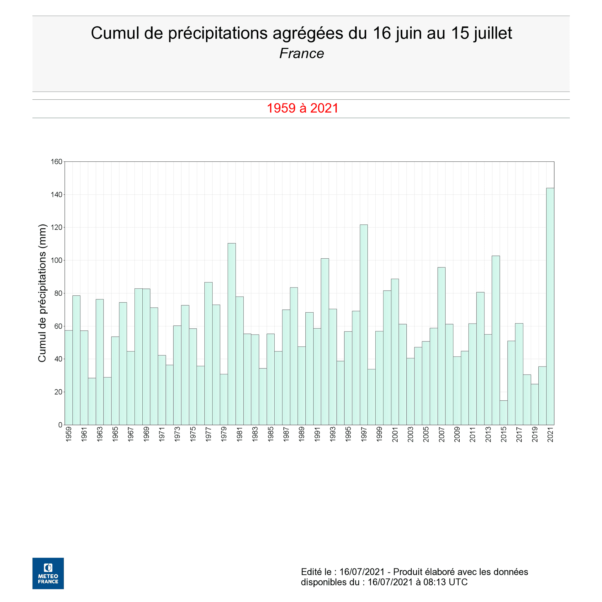 Désormais en plein cœur de la saison estivale, cette situation humide ne s'est pas pour autant estompée. A contrario, les pluies se sont accentuées et cette première partie d'été 2021 est exceptionnellement humide. Du 16 juin au 15 juillet (30 jours), il est tombé 144mm en moyenne en France (soit deux fois au delà de la moyenne), un record sur cette période de l'année depuis le début de la série statistique en 1959, bien largement au delà du début d'été 1997.