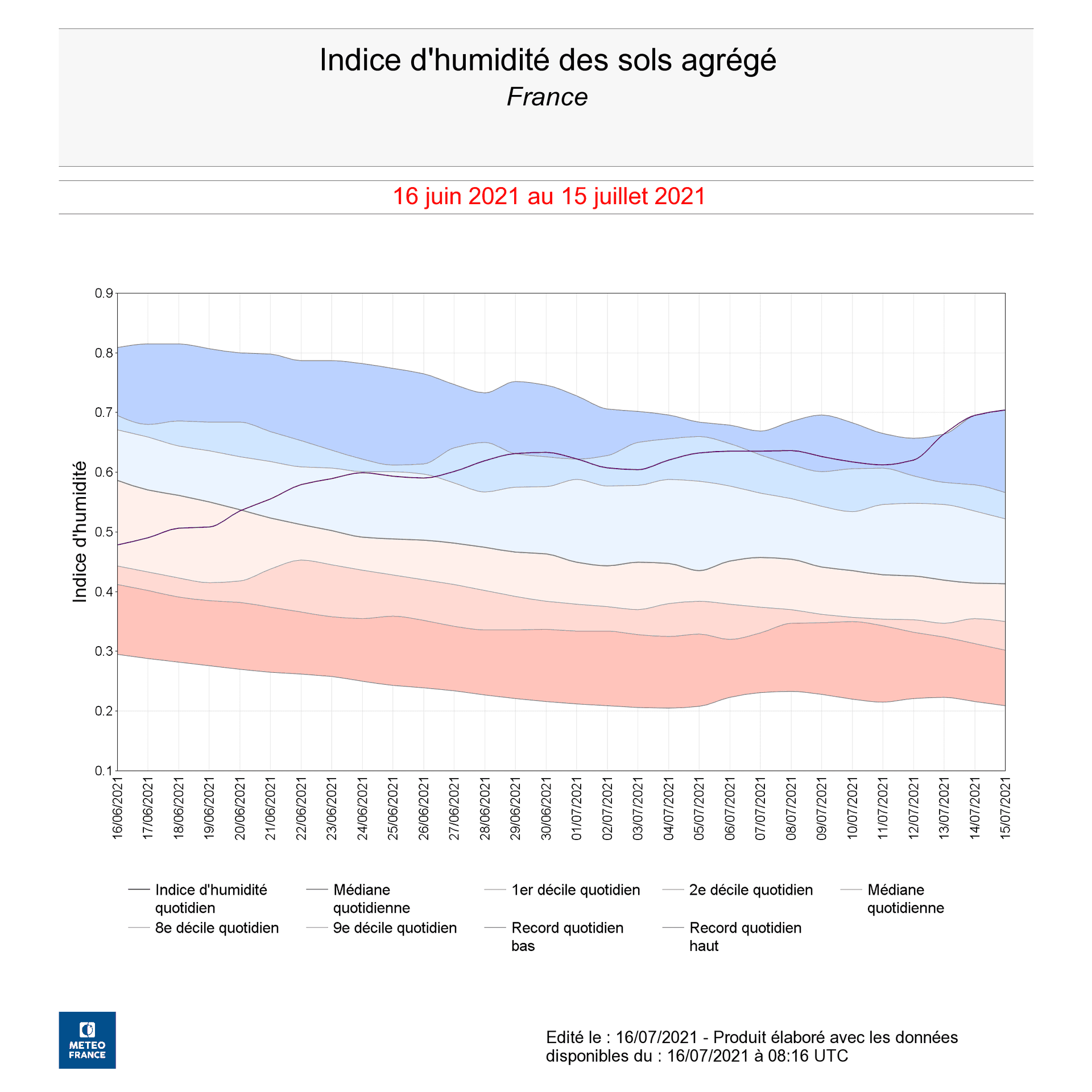 Indice d'humidité des sols en France du 16 juin au 15 juillet 2021 - Météo-France via Gaetan Heymes