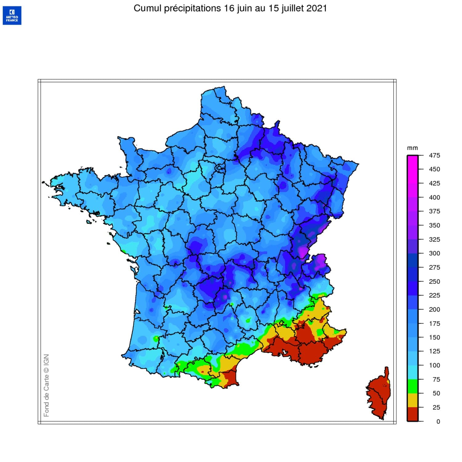 Cumul des précipitations agrégées en France - période du 16 juin au 15 juillet 2021 - Météo-France via Gaetan Heymes