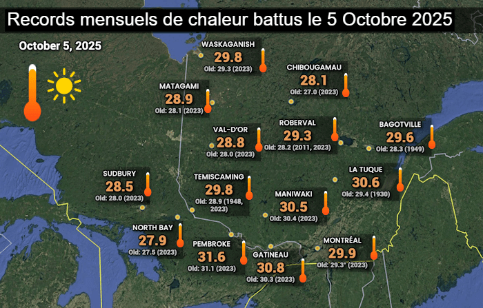 Records de chaleur mensuels battus ce dimanche 5 octobre 2025 - via Patrick Duplessis / MétéoMédia