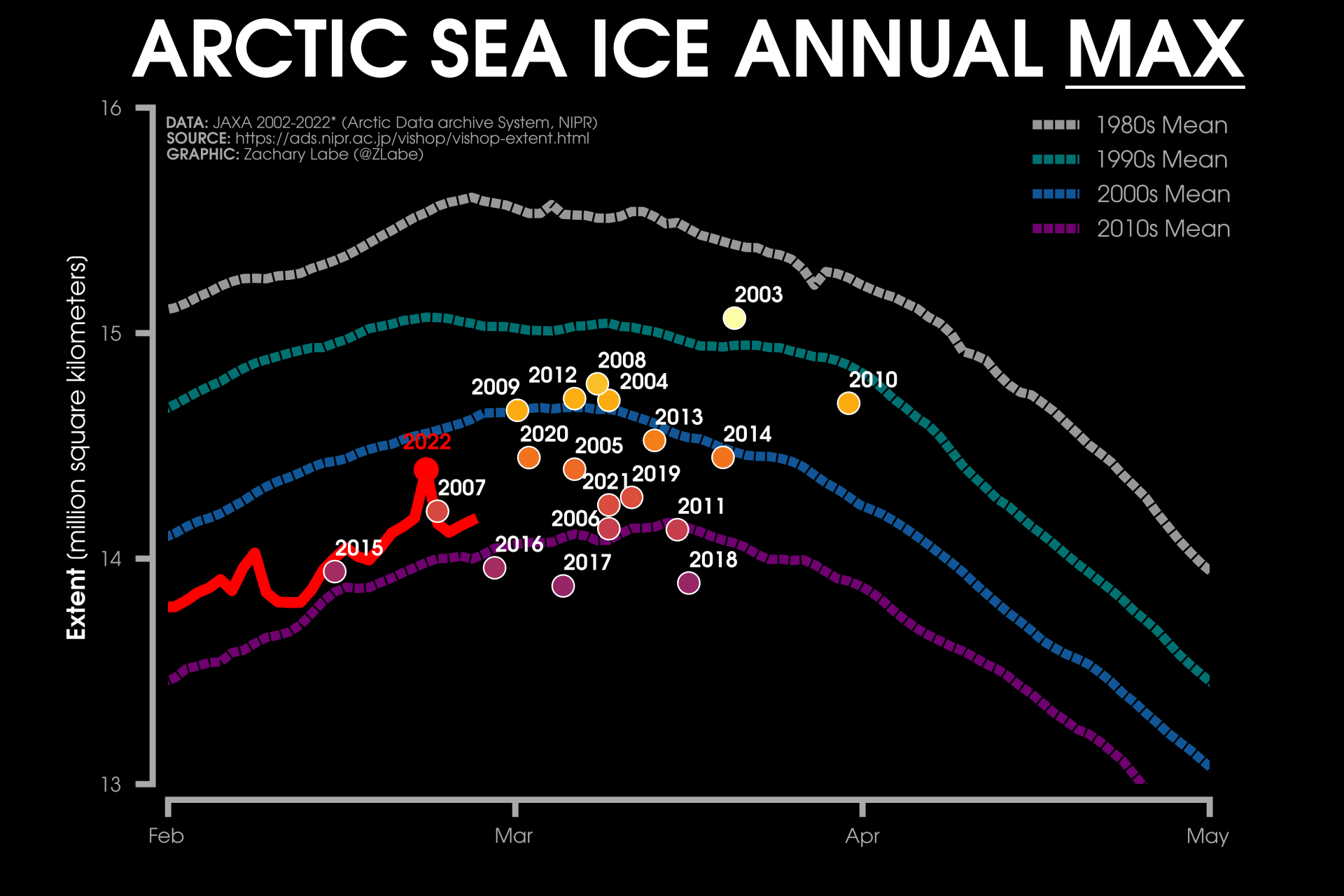 Étendue de la banquise Arctique en millions de km2 - période 1er janvier - 1er mars depuis 1979 - Zachary Labe – JAXA