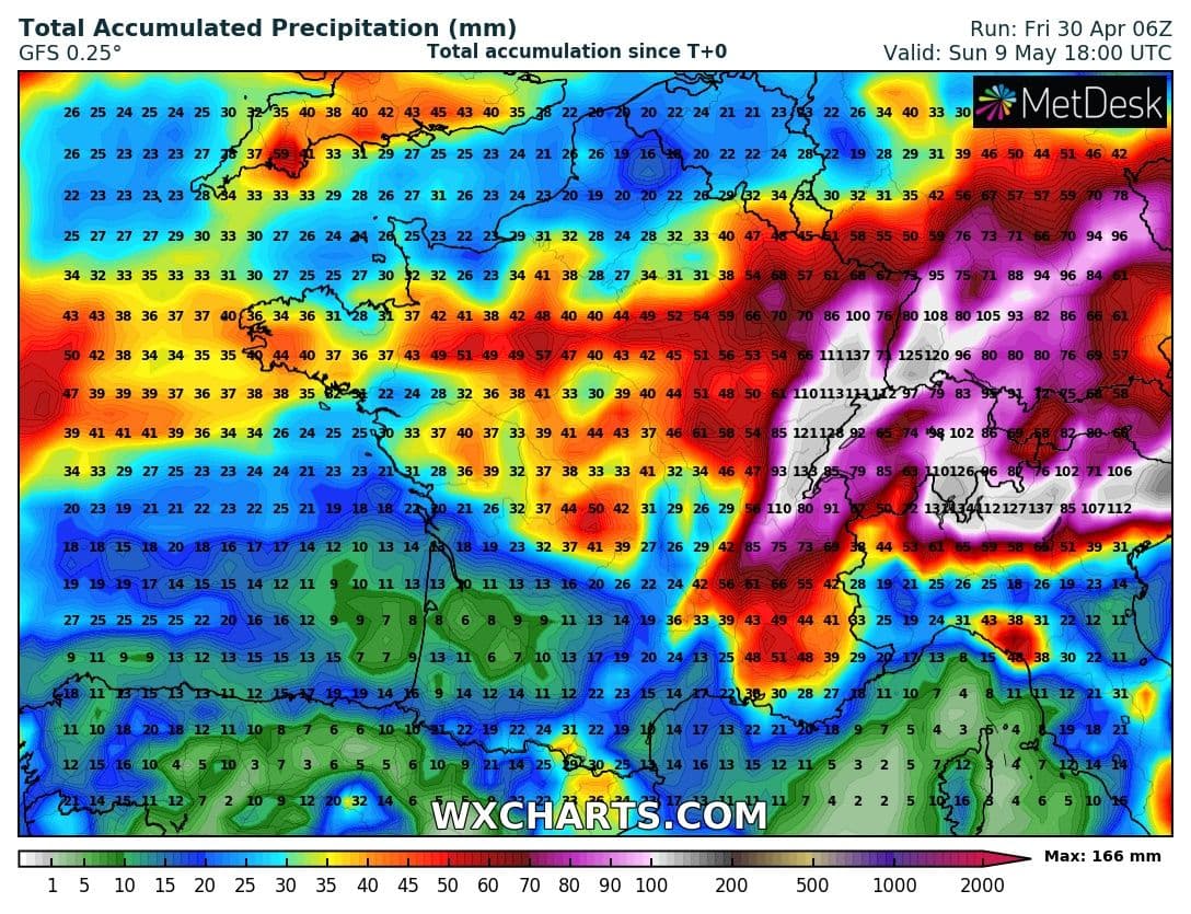Cumuls de précipitations envisagés du vendredi 30 avril au dimanche 9 mai sur la France – Modèle GFS via WX CHARTS