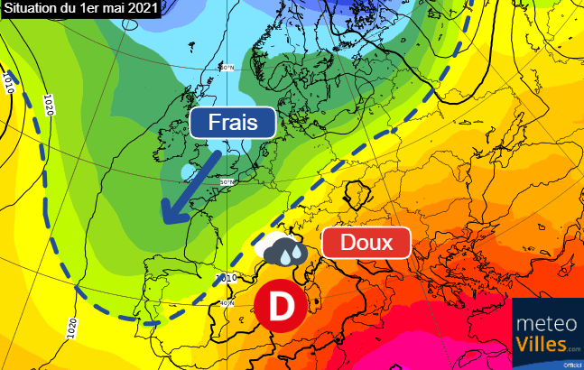 Schéma de la situation atmosphérique sur l’Ouest de l’Europe ce samedi 1er mai 2021 – ECMWF, modifié par Météo-Villes
