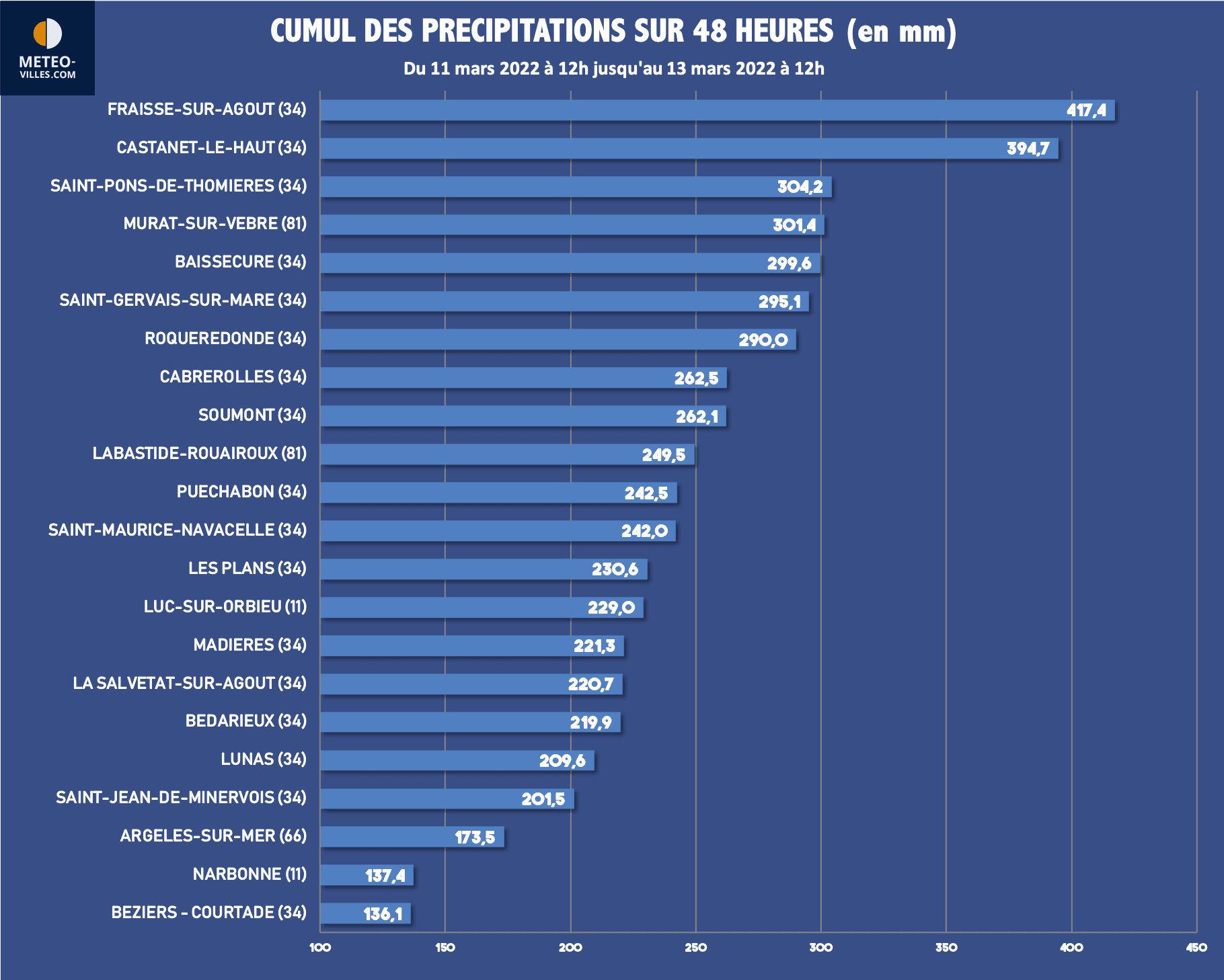 En parallèle, une convergence humide peu mobile s'est accompagnée d'intenses précipitations en matinée du samedi 12 mars, entre la Côte Vermeille (Pyrénées-Oientales) jusqu'au Minervois (Aude) avec des intensités de l'ordre de 30 à 40mm par heure. Sur cet axe, les cumuls s'élèvent entre 100 et 150mm, voire même plus de 200mm sur l'Aude (229.0mm/48h à Luc-sur-Orbieu).