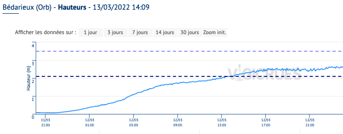 Hauteur d'eau de l'Orb sur la commune de Bédarieux (Hérault) - 12 mars 2022 - Vigicrues