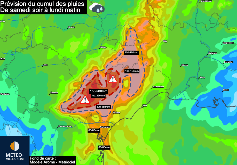 Entre ce samedi soir, et lundi matin, nous attendons un cumul supplémentaire de 150 à 200mm sur les Cévennes Héraultaises (loc. 250mm), soit près de 400mm sur l'ensemble de l'épisode (moins de 4 jours). Il est également attendu entre 100 et 150mm sur le massif de l'Aigoual, dans le Pays Viganais (Gard) ainsi que dans les plaines de l'arrière-pays Héraultais.