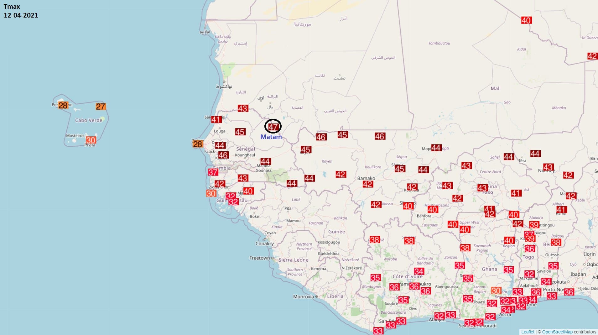 Plus au nord, la chaleur fut également très marquée au Sénégal le 12 avril dernier avec jusqu’à 47.0°C à Matam, à 1°C du record national d’avril. Cette valeur marque également les premiers 47°C de 2021 dans l’hémisphère Nord.
