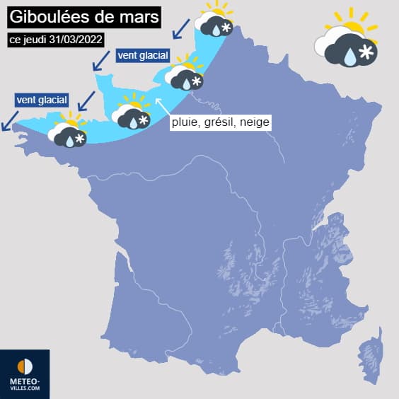 L'air froid va débouler sur le nord et le nord-ouest de la France ce jeudi 31 mars 2022, en provenance d'Angleterre et de Mer du Nord. La baisse des températures sera sensible et un puissant vent de nord à nord-est se mettra à souffler sur les régions bordant la Manche, atteignant 60 km/h dans les terres et 80 km/h sur les côtes. Avec la présence d'air froid en altitude, les averses se produiront sous forme de pluie, de grésil et de neige - de véritables giboulées de mars !