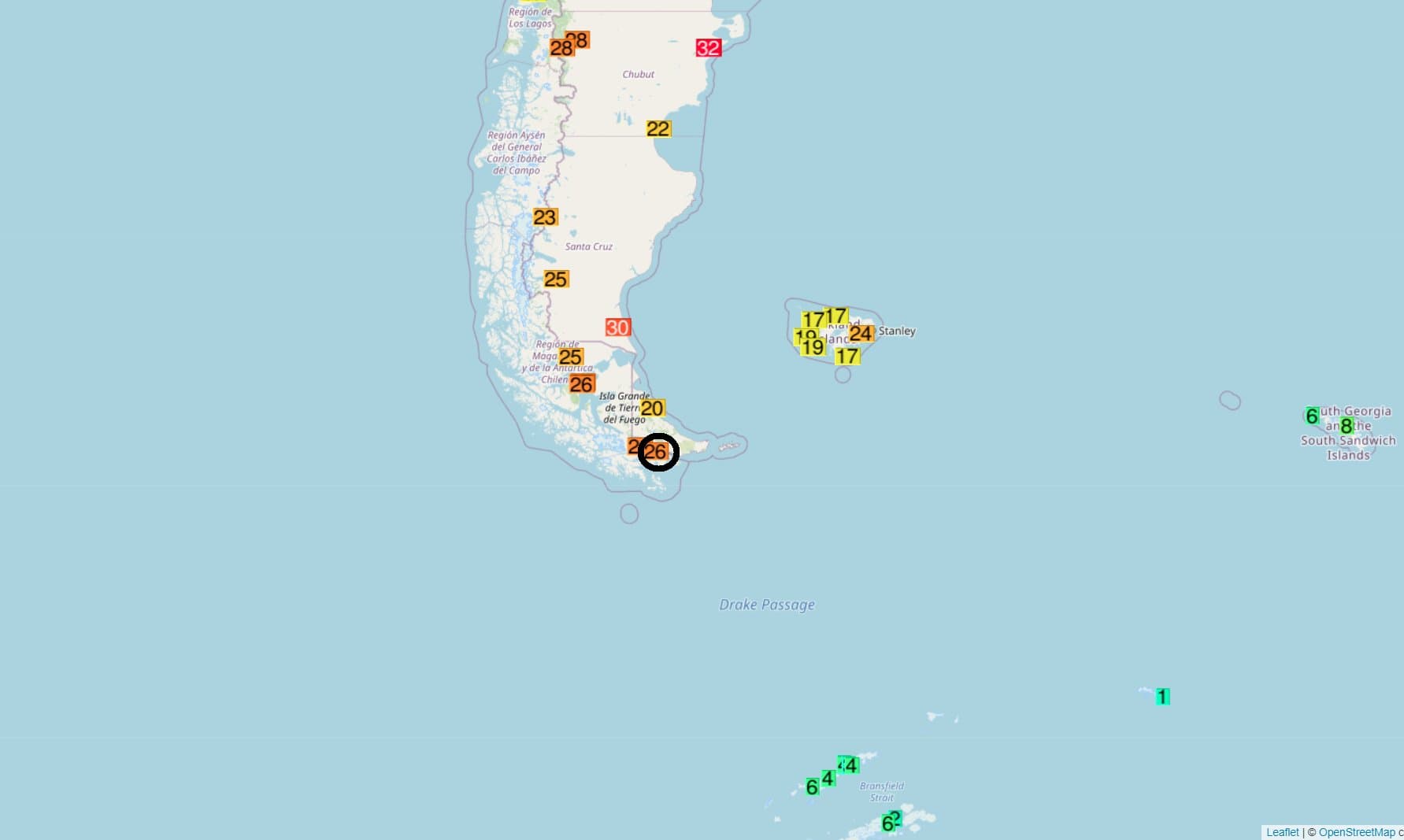 Le 27 février, la Terre de Feu battait également un record absolu de température avec 26.1°C à Puerto-Williams (station la plus méridionale du continent sud-américain). Cette température établi un record tout mois confondu pour cette localité, battant les 26.0°C de décembre 1984.