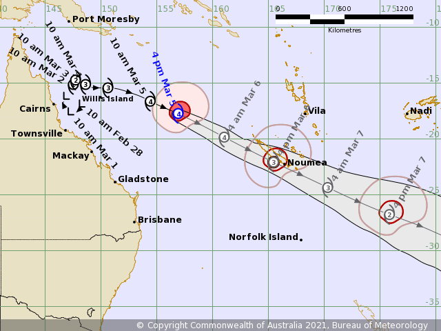 Son œil devrait circuler à quelques kilomètres au large de la côte Sud de Nouvelle-Catégorie, frôlant Nouméa. Néanmoins, de violentes rafales de vent (parfois supérieures à 200km/h sur le Sud de l'île), des précipitations diluviennes et une marée de tempête importante sont attendus.