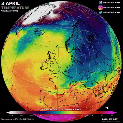 Température à 850hPa (1500m d'altitude) - animation du 3 au 6 avril 2021 - modèle GFS via ScottDuncanWX