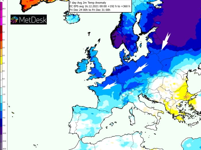 Si les modèles pataugent ces derniers jours, c'est toutefois le deuxième scénario proposé ci-dessus qui prend un net avantage lorsque l'on regarde l'ensemble des modèles en date du 16 décembre 2021. Autrement dit, celui d'un conflit de masses d'air sur le pays. D'ailleurs, les ensemblistes (moyenne de tous les scénarios) font clairement ressortir cette tendance pour la période de Noël : un anticyclone migrant vers l'Islande et des basses pressions des Açores vers le bassin méditerranéen.