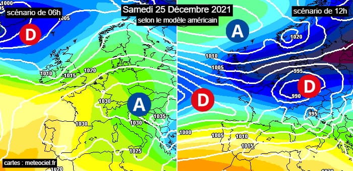 Scénarios de 6h (à gauche) et de 12h (à droite) du modèle américain pour le 25 décembre 2021 - via meteociel.fr