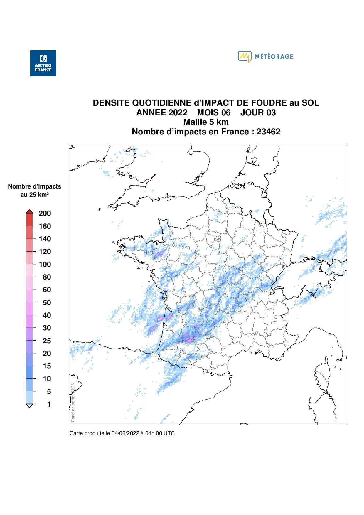 Au total, pas moins de 23.462 impacts de foudre ont été recensés sur cette seule journée du 03 juin, soit la journée la plus foudroyée de cette année 2022.