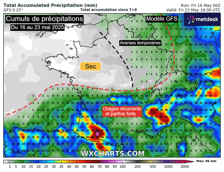 Cumuls de précipitations du 16 au 24 mai 2025 sur la France – Modèles GFS et ECMWF HRES via WX CHARTS