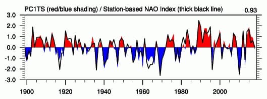 Moyenne annuelle de l'indice d'oscillation nord-atlantique (NAO) depuis 1900 - via NOAA